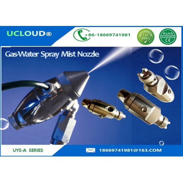 Ucloud gas-water mixing spray gun is composed of atomizing nozzle, control system and filter sterilization annex and other components. UYS-B spray gun with automatic clearance of the outlet scale and dust, the pneumatic needle valve with water-drip prevent function. Under the control of the intelligent control, it can control the the flow rate of the compressed air and thus control the reciprocating movement of the pneumatic needle valve. By this, the needle will clean the water scale and dust. When the control in the working status it has the cleaning function. When the compressed air is off or the pressure is lower than 0.2 Mpa, the needle will seal the water outlet part, and no water will come out.